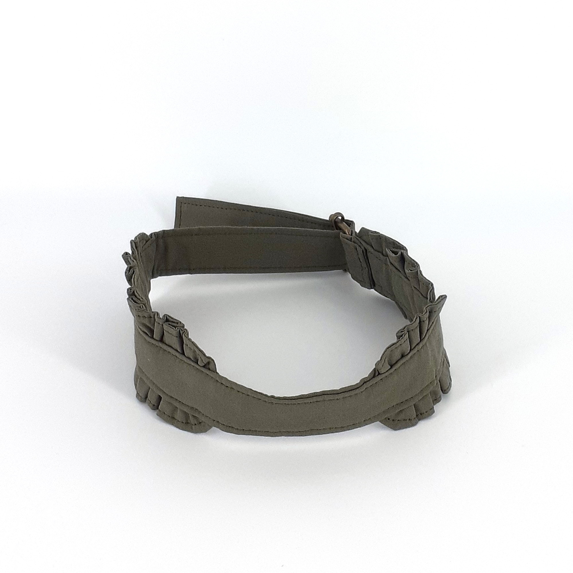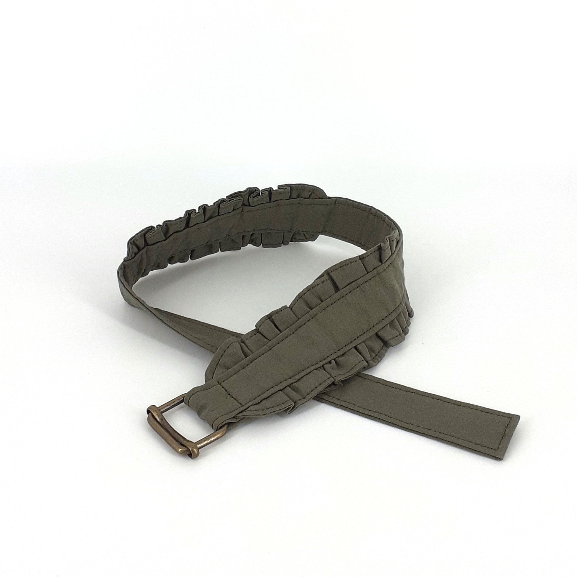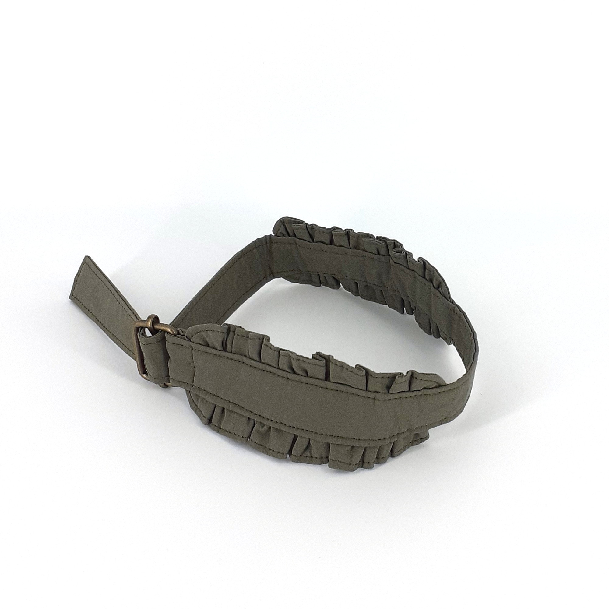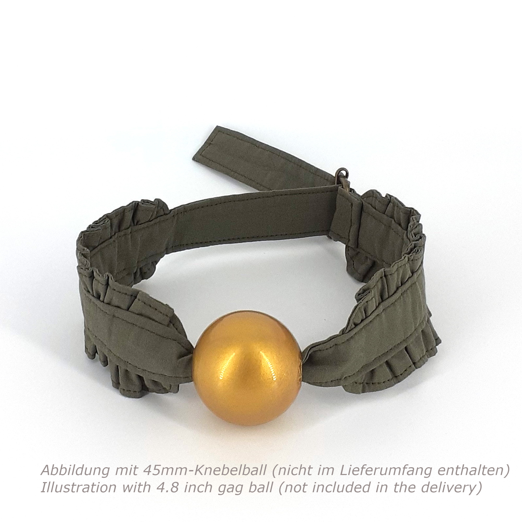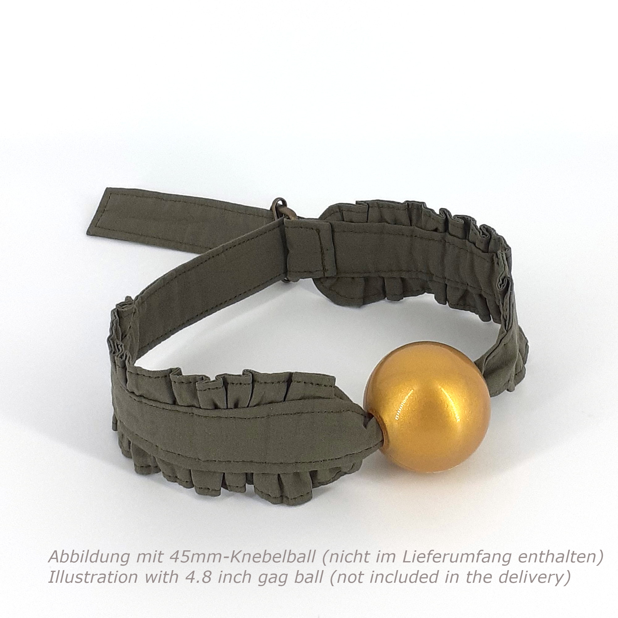 Das Band wurde aus vorgewaschenem Baumwollstoff gefertigt und mit einer Messingschnalle versehen. Sie können das Band mit nur einer Hand festziehen oder lösen. Ein beliebiger Knebelball kommt in die Mitte zwischen die sorgfältig und aufwändig gerüschten Abschnitte.